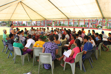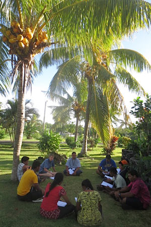 When it rained, groups continued their study unhindered by the elements, huddled under tents and in the smaller fales that lined the beach. When the sun shone, participants scattered throughout the conference grounds, some choosing to sit in the shade of a coconut tree, while others sat by the seaside.