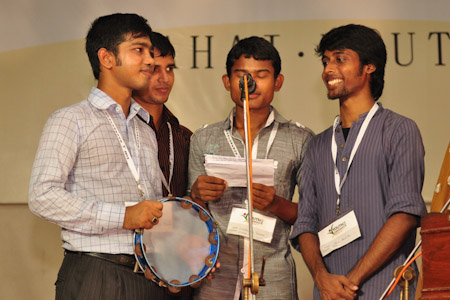 The evening plenaries featured artistic presentations that the youth had prepared earlier in the day, based on insights gleaned from the study of the conference materials. Others had been practicing for some time to share with their fellow participants traditional songs and dances, reflective of the vibrant tapestry of the cultural heritage of the region. In all cases, the presentations reflected the joy of learning and the spirit of love that permeated the three days of the conference. The sounds of the dhol, harmonium, guitar, and tabla filled the air as the youth shared songs. One of the presentations was a mime—the first time many had seen this art form—depicting a young man who struggled against the negative forces represented as a wall, in order to join his friends working for constructive change on the other side. Inspired by their hope, he managed to break down the wall and participate in the community-building process with his peers.