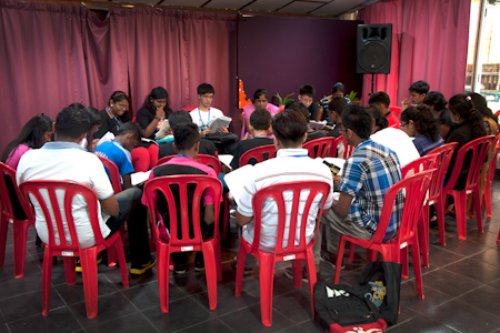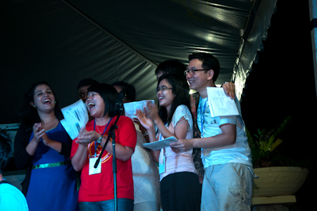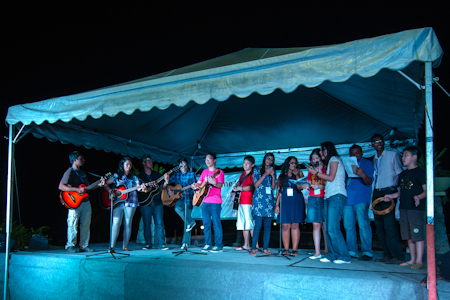As the sun was setting across the seafront, the distant sound of songs in different languages could be heard as the young people prepared for their artistic presentations. Groups dispersed to rehearse and dress up for the evening programme, and as the night drew to a close, the participants proceeded up the breezy coastal path to a stage that was set up on a raised canopied platform by the beach. What followed was a rich and diverse array of musical performances, dances, and skits, all of which were connected to the study materials. Highlights included a Malay folk song named "Rasa Sayang" with lyrics rewritten by some participants to reflect their acts of service in the community, an original Mandarin song about love and serving together through trials, a traditional Indian dance called the "Bharatha Natyam", and the last song of the night named "One Nation" that ended with a confetti blast, taking the crowd by surprise! The spirit of the evening was participatory and on a few occasions many rose to their feet to join in with the dancing on stage.