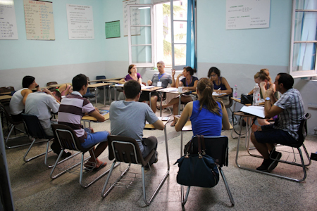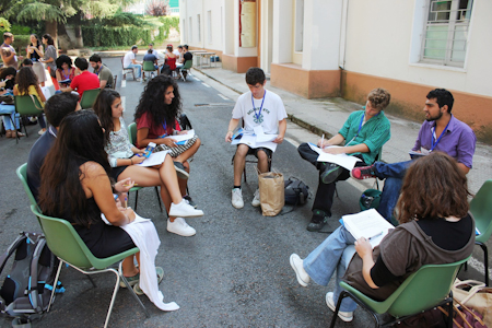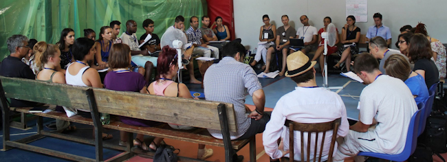 The high temperatures of the first day did not distract the participants from focused consultation on the role of their generation, and was eventually quenched by a heavy thunderstorm. During breaks, the school walls buzzed with enthusiasm as participants from all countries joined together in song to the beat of drums. In the evening, the energy of those present intensified and, as the various groups presented songs, poems, and dramatizations based on the insights they had gained during the day, those gathered cheered, clapped, sang, and danced along. The fatigue from their travels could not prevent them from enjoying the lively atmosphere that had been created.