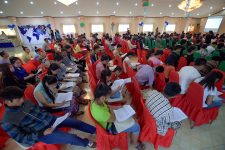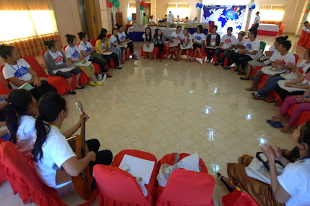 During breaks, youth could be seen preparing for the sessions, and exchanging ideas based on their experiences, and singing uplifting songs that added to the joyous atmosphere of the gathering. Evening plenaries included artistic presentations created by the participants and inspired by their study of the conference materials. One group shared a drama depicting the effects of social forces on the younger generation. Another presented a traditional Laotian dance. The theme song of the conference, “Leaves of One Tree”, was joyfully sung by all.