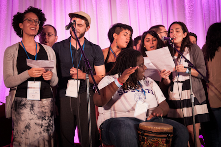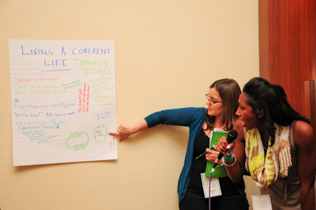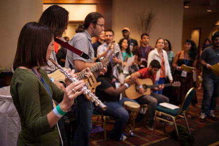 Arts were a significant aspect of the gathering as the participants found numerous creative ways to explore and express the concepts they studied during the weekend. One group performed a skit on the false choices that youth sometimes face, such as choosing between service or study, when in reality the two are essential aspects of a coherent life. Another group led the entire gathering in a rousing song on guitars and drums with the lyrics: “Two lungs take one breath, two feet walk one path, like two wings of one bird, we can kick it and serve!”
